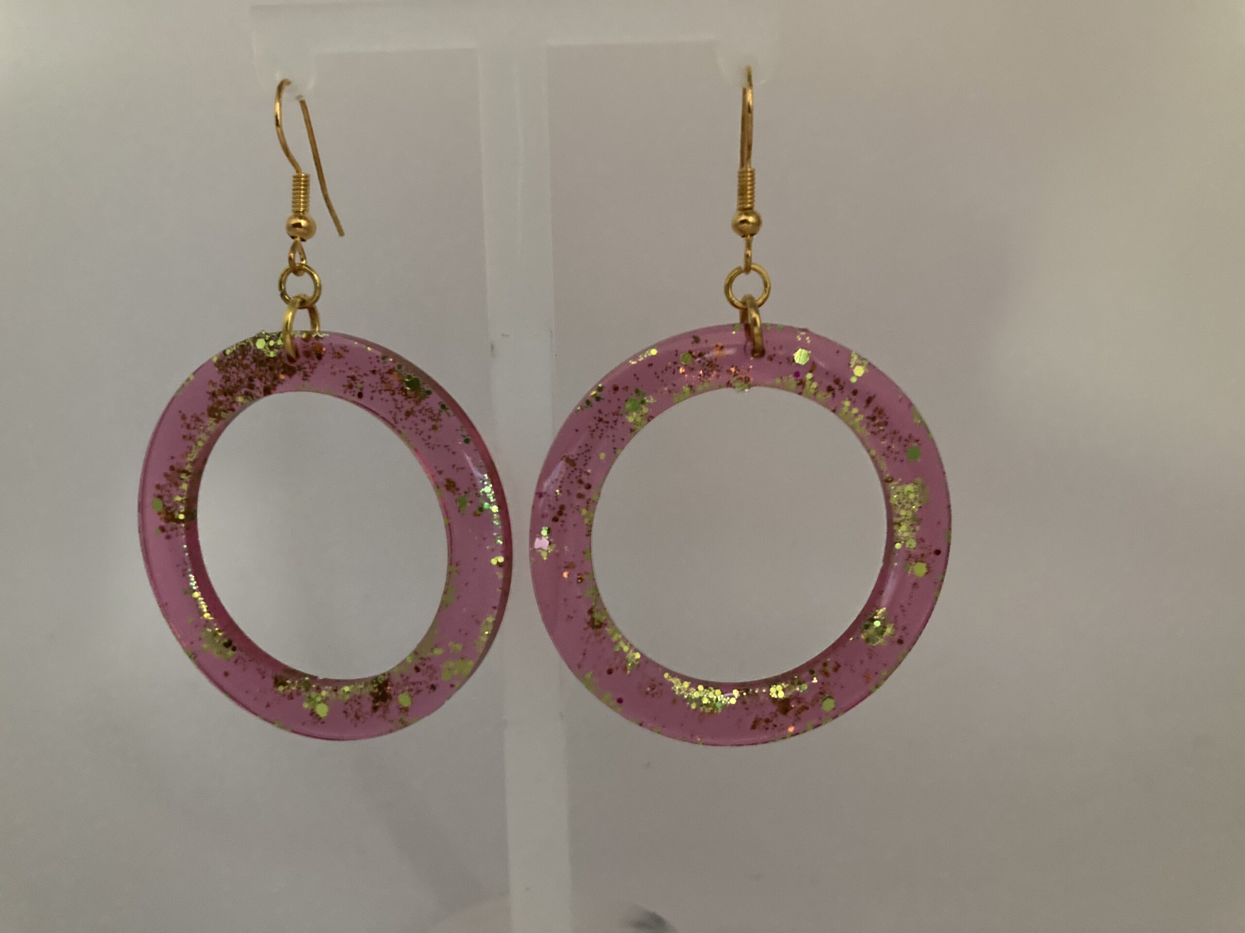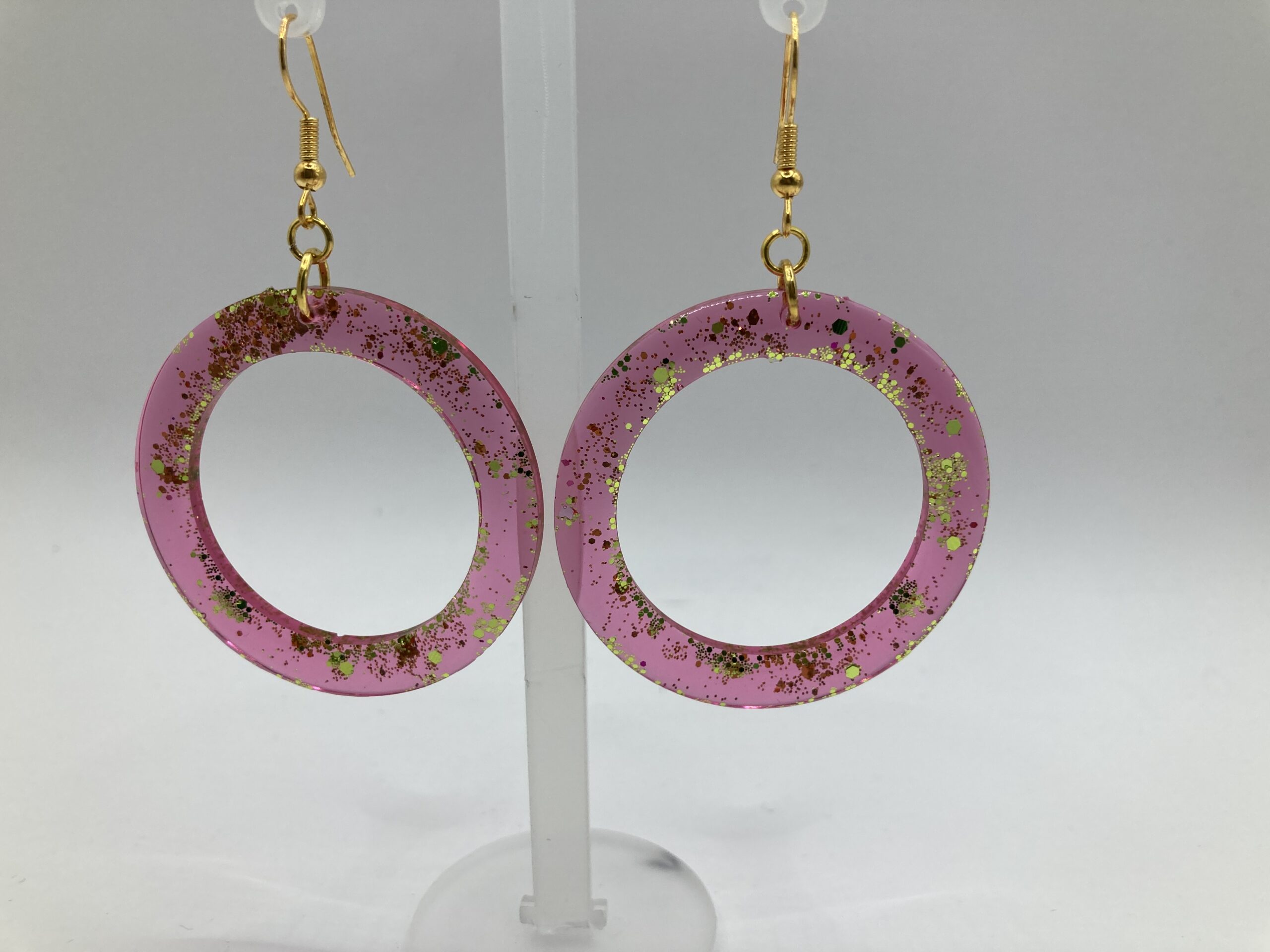 Boucles d’oreilles en résine teintée en rose, en forme de cercle fin incrustées de paillettes vertes.