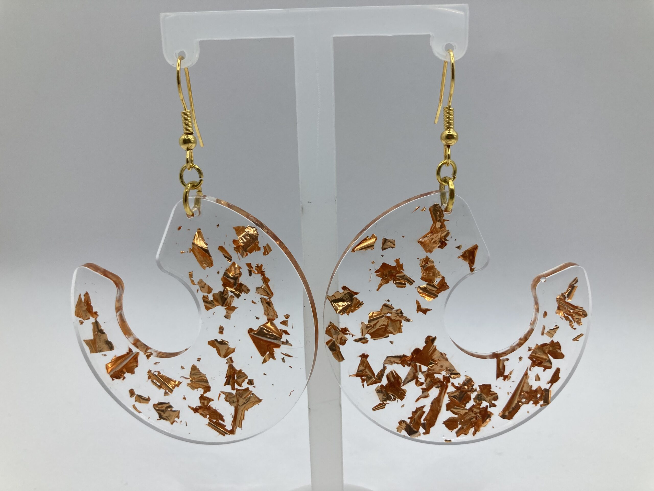 Boucles d’oreilles en résine, en forme de créole ouverte incrustées de feuilles cuivrées.