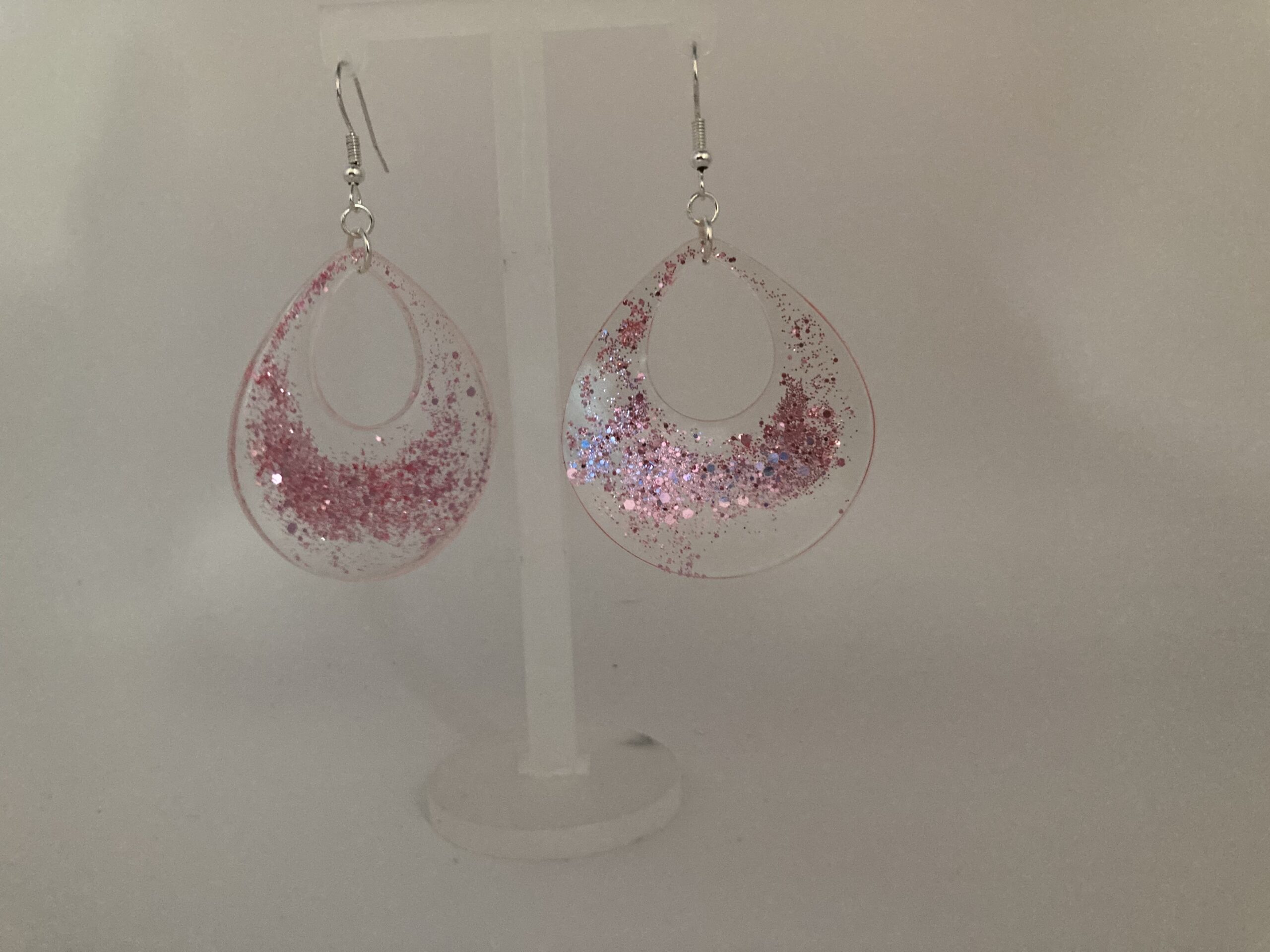 Boucles d’oreilles en résine forme de goutte incrustées de paillettes.