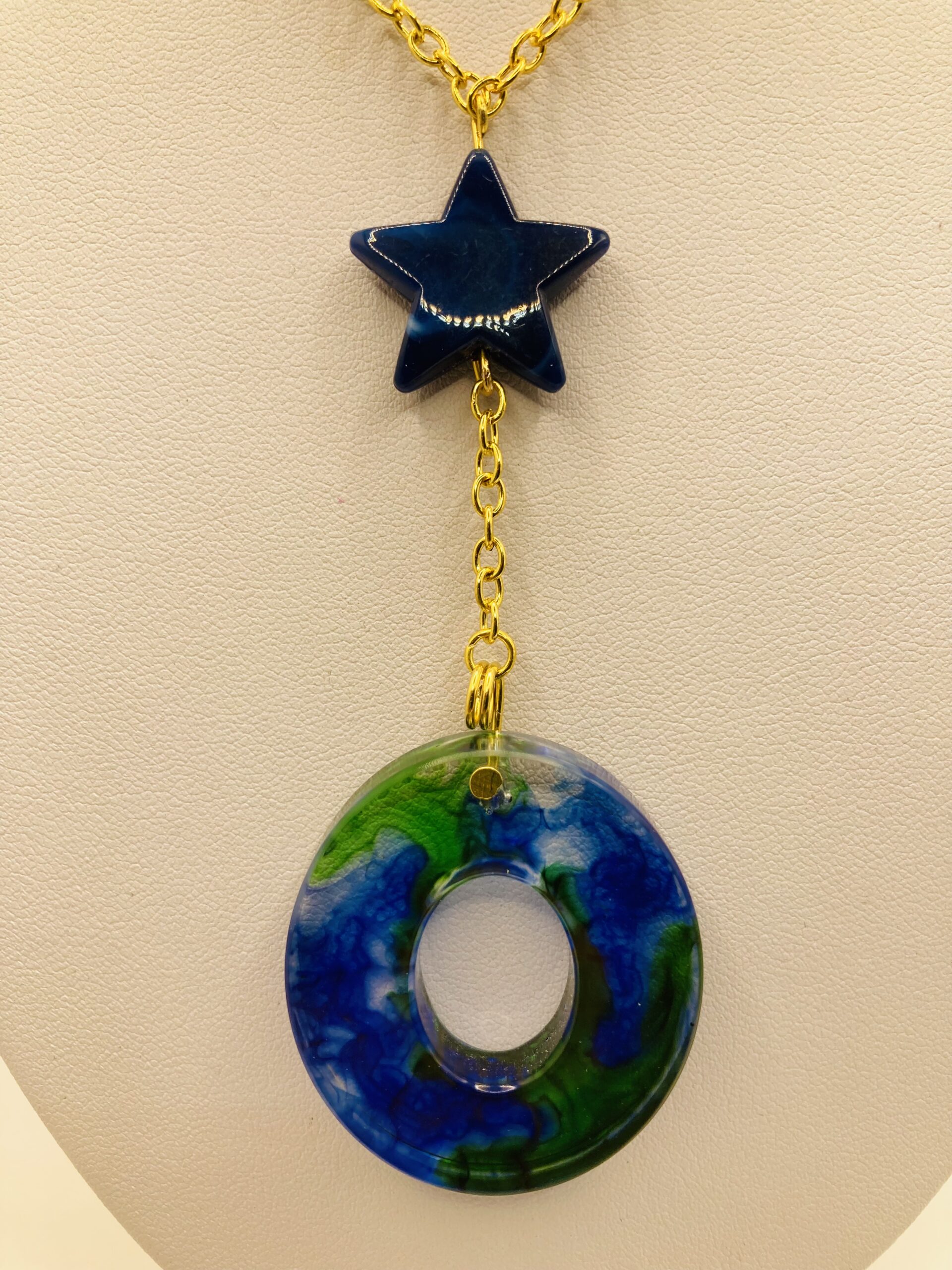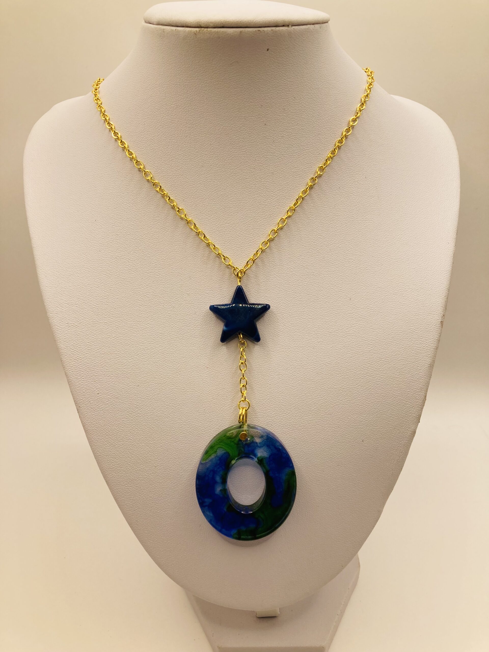 Pendentif composé d’un ovale en résine coloré d’un dégradé de bleu et vert surmonté à 3cm d’une étoile bleu.