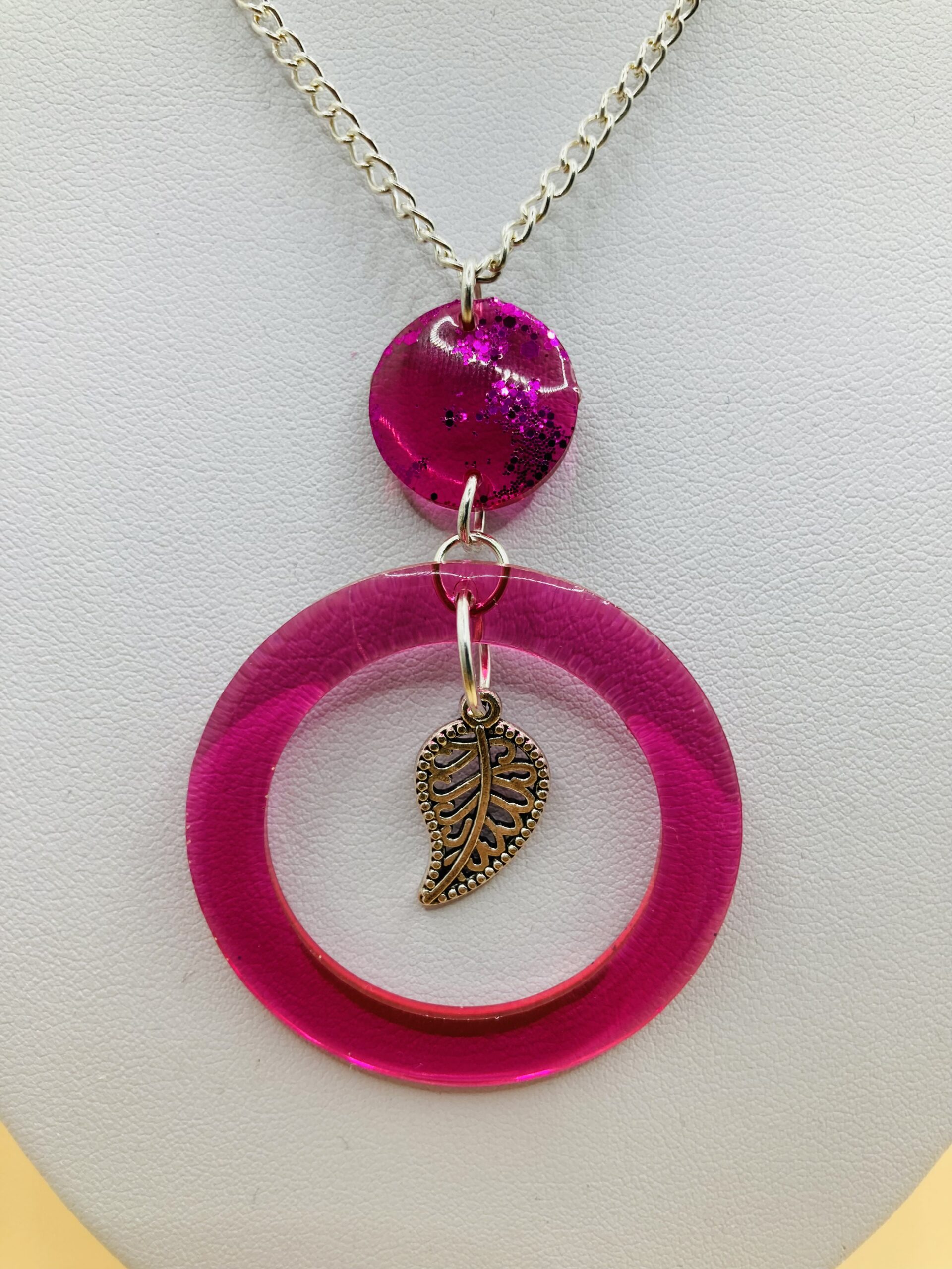 Pendentif en résine colorée en rose, pendentif en cercle et une feuille argentée au centre du cercle, le tout surmonté d’un rond en résine rose incrusté de paillettes roses.