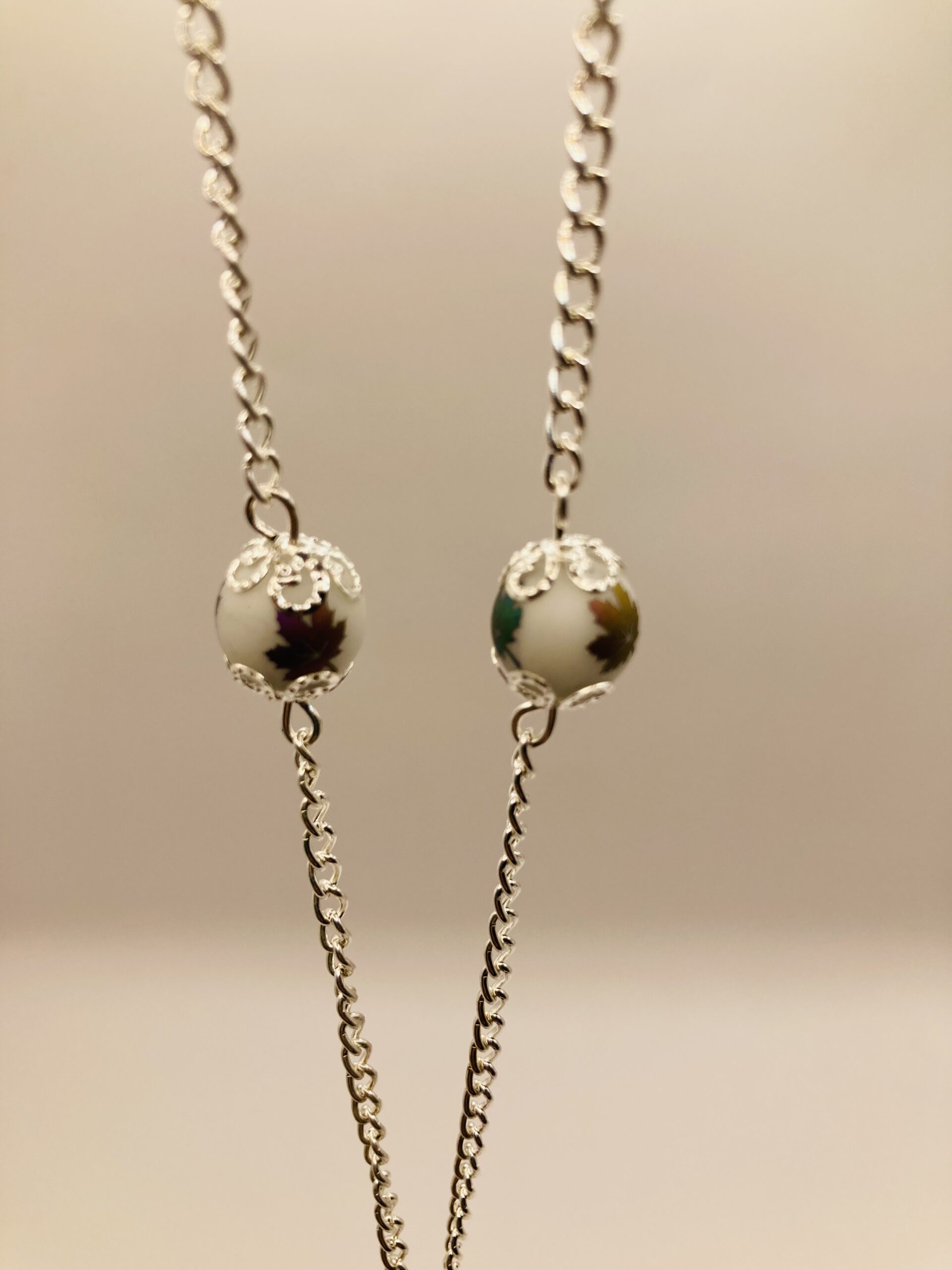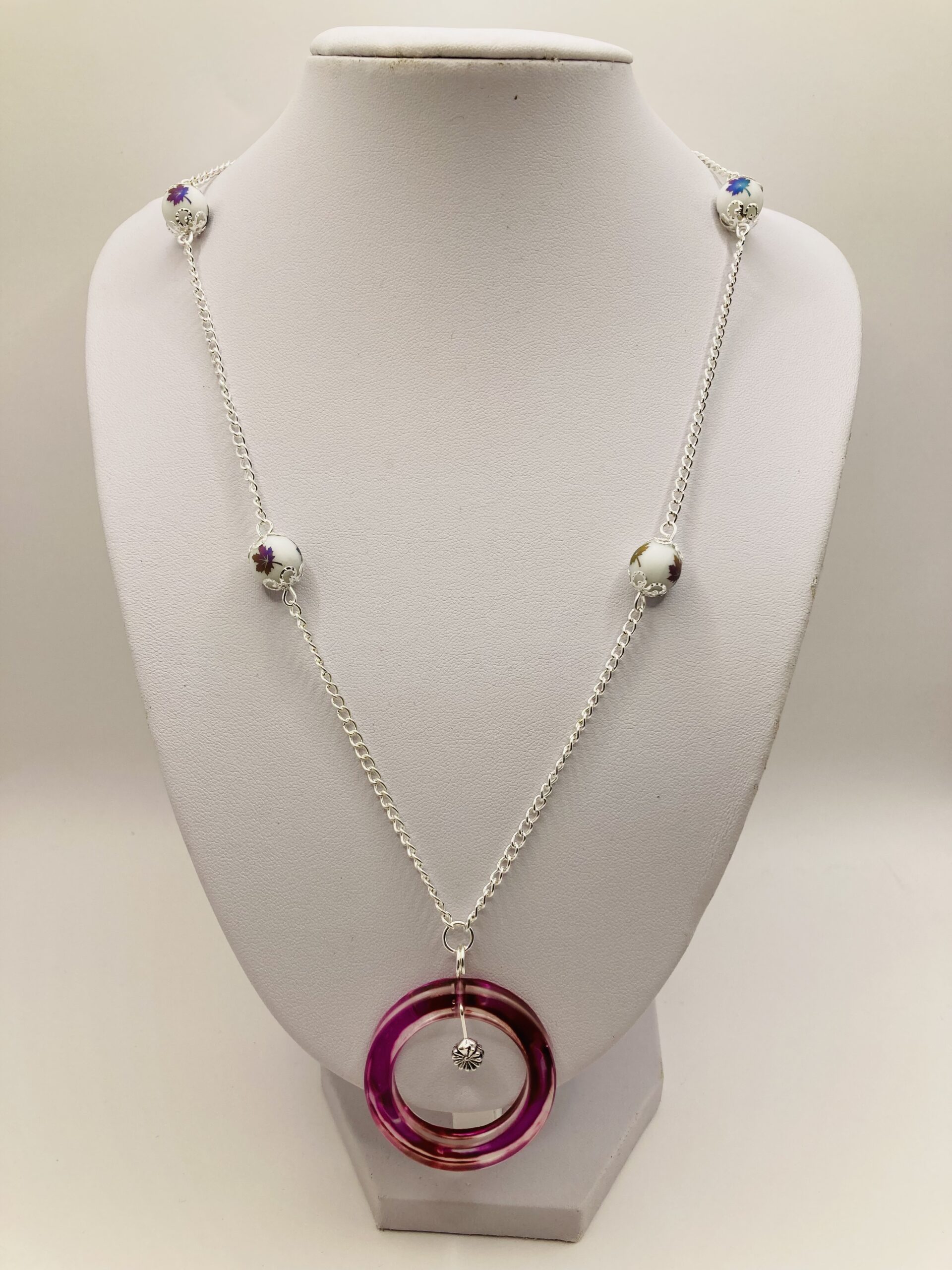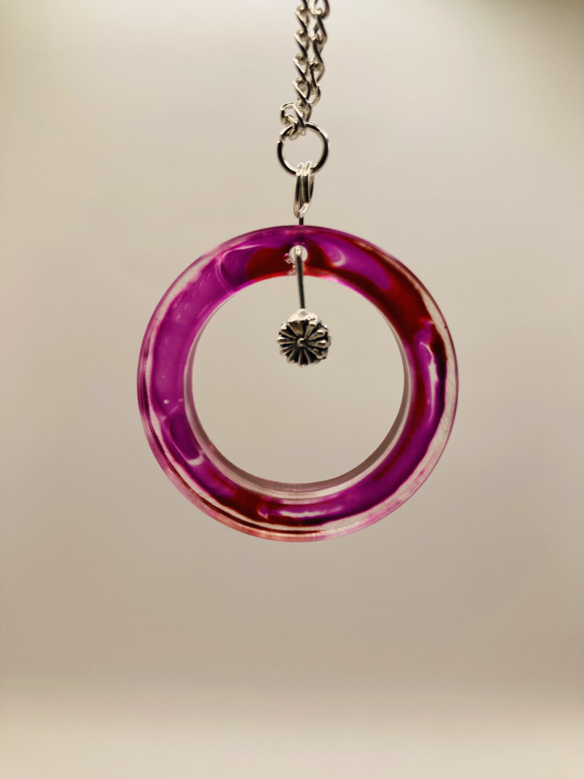 Pendentif composé d’un cercle en résine avec coloration marbrée ton rouge, à l’intérieur du cercle pend une petite décoration en forme de fleur couleur argentée. Le long de la chaine symétriquement courent 2 perles blanches aux motifs de feuilles aux couleurs changeantes.